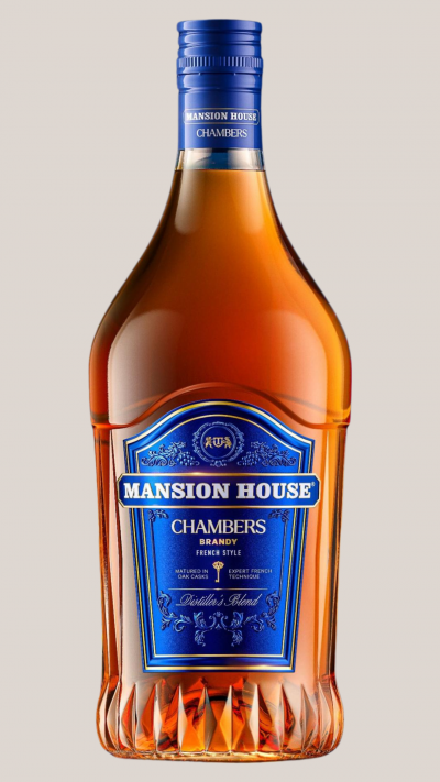 Mansion House Chambers VSOP Brandy offers a golden hue, complex fruity aromas, and a sculpted blue bottle for a refined, luxurious experience.