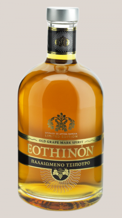 "Eothinon" barrel-matured grape marc distillate, crafted from regional grapes, aged in oaken barrels for 6+ months, offering rich color & aroma.