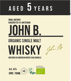 John.B organic certified, single malt whiskey is distilled from organic certified barley malt grown in our povince Zeeland. The whiskey matured for 10 years in white American oak (quercus alba) barrels and was cold filtered before bottling. Alc. 43% vol - Cont.:.: 700 ml
