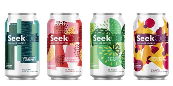 SeekOut Real Hard Seltzer will launch with four unique varieties; Key Lime + Mint, Raspberry + Meyer lemon, Cucumber + Juniper, and Pineapple + Passion Fruit. At 5 percent ABV, and only 100 calories per can, they will be available in 6-pack 12oz cans, as well as on draft in 1/2bbl kegs. A variety 12-pack will also be available at launch, containing all four seltzer varieties.