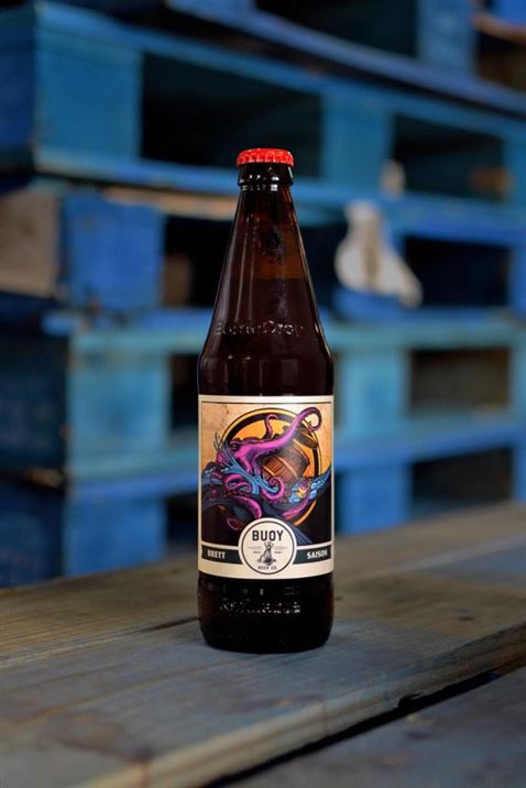 This marks the second specialty bottle release by Buoy Beer Company and the continued use of their specialty bottle label. A departure from their classic logo-centric year-round and seasonal labels, the specialty label artwork incorporates artwork from Pacific Northwest artists. The Brett Saison label artwork was created by Ashley Montague, an artist from Portland. The label depicts an octopus pouring himself a beer from the Foeder.