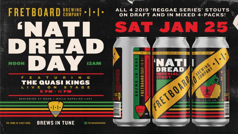 We’re making an entire day of this release, and it includes tapping of all four 2019 “Reggae Series” beers (‘Nati Dread, Cool Meditation, Leggo Beast & Cliftone Cookie Jar), as well as a performance from Fretboard newcomers, and Columbus natives, The Quasi Kings!