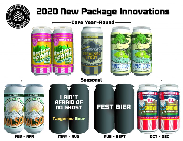The Oakshire team is excited to announce changes to their 2020 Core and Seasonal Programs, including moving two favorites from Seasonal into their Core lineup, in brand new packaging – The Perfect Storm Double IPA and Reclaim the Fame West Coast IPA. While Oakshire will continue to use 22oz. bottles for barrel-aged and Vintage releases, they will move Seasonal beers into 16oz. 4-packs, which include: Key-Lime-ity Kolsch with Honey, I Ain’t Afraid of No Ghost Tangerine Sour Ale, Fest Bier, and Ill Tempered Gnome Winter Ale. Core beers in 12oz. 6-packs will remain, and the go-to breakfast beer, Overcast Oatmeal Espresso Stout, will also have a 16oz. single can option. Reclaim the Fame West Coast IPA and the Perfect Storm Double IPA will be available on draft and in 16oz. 4-packs aroundOregon, Washington, and Colorado, and in Oakshire’s taprooms, the Public House in Eugene and the Beer Hall in Portland, starting after January 21st.