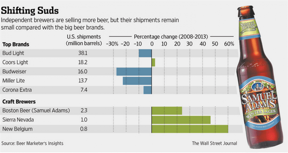 Four of the five largest U.S. beer brands, including AB InBev’s Budweiser and Bud Light, posted volume declines last year. There are more than 3,000 small “craft” brewers in the U.S., twice as many as half a decade ago, and their combined shipments have grown by a double-digit percentage five straight years, according to the Brewers Association, which represents small brewers.