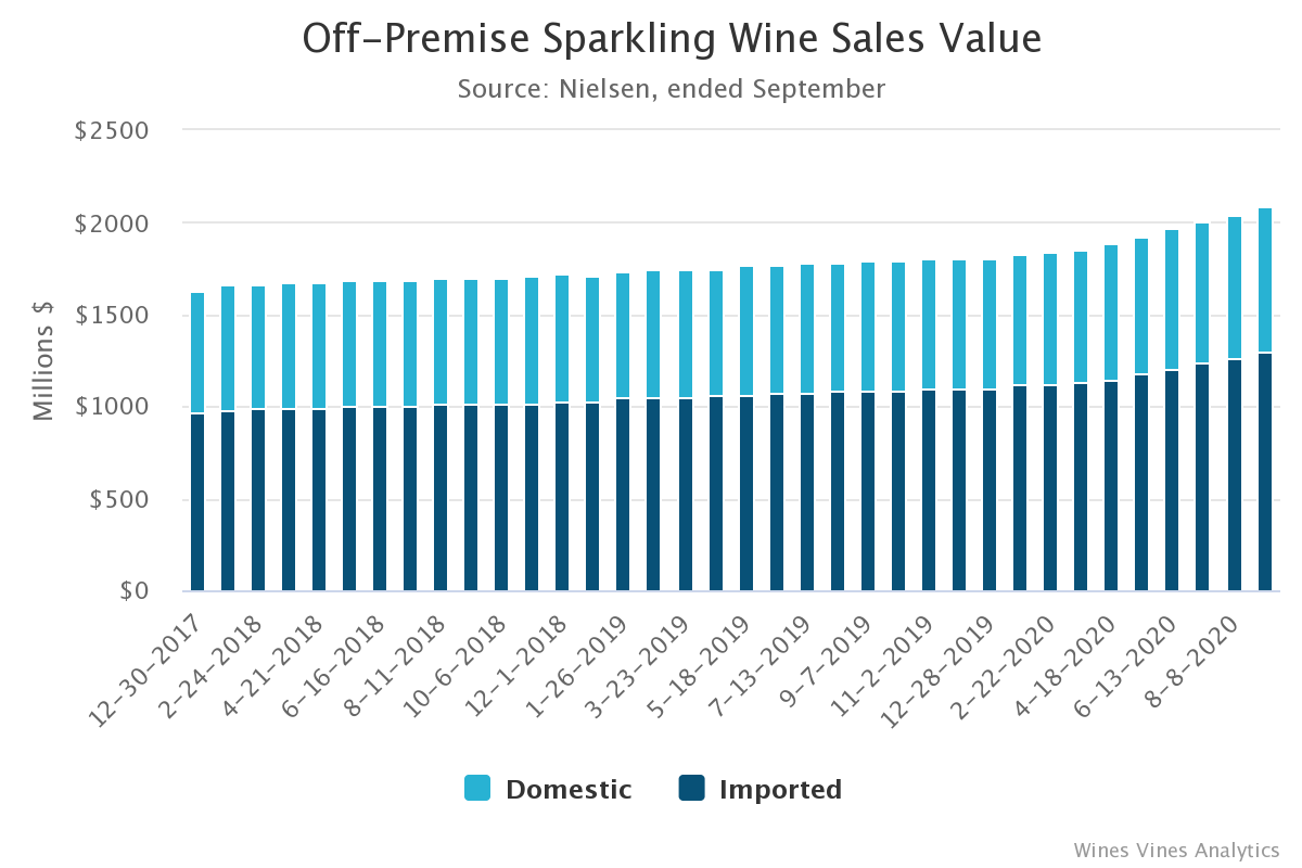 Scan data from Nielsen off-premise outlets show domestic sparkling wine sales in the 52 weeks ended Sept. 5 exceeding $789 million, up nearly 12% from a year ago. Growth accelerated during the COVID-19 pandemic, notwithstanding concerns that no one was feeling particularly bubbly during the initial lockdown period.